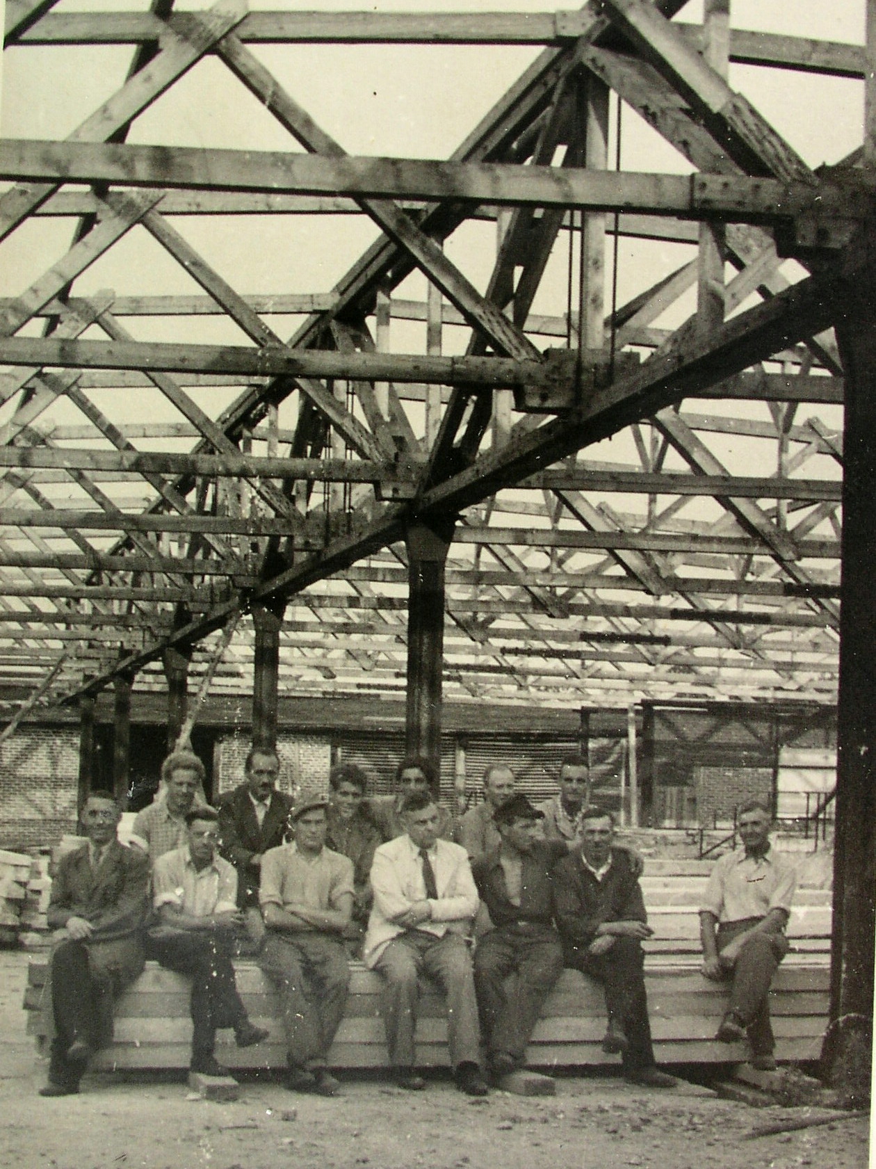 Antonius Kufferath (mit Krawatte) inmitten seiner Arbeiter beim Wiederaufbau nach dem 2. Weltkrieg.