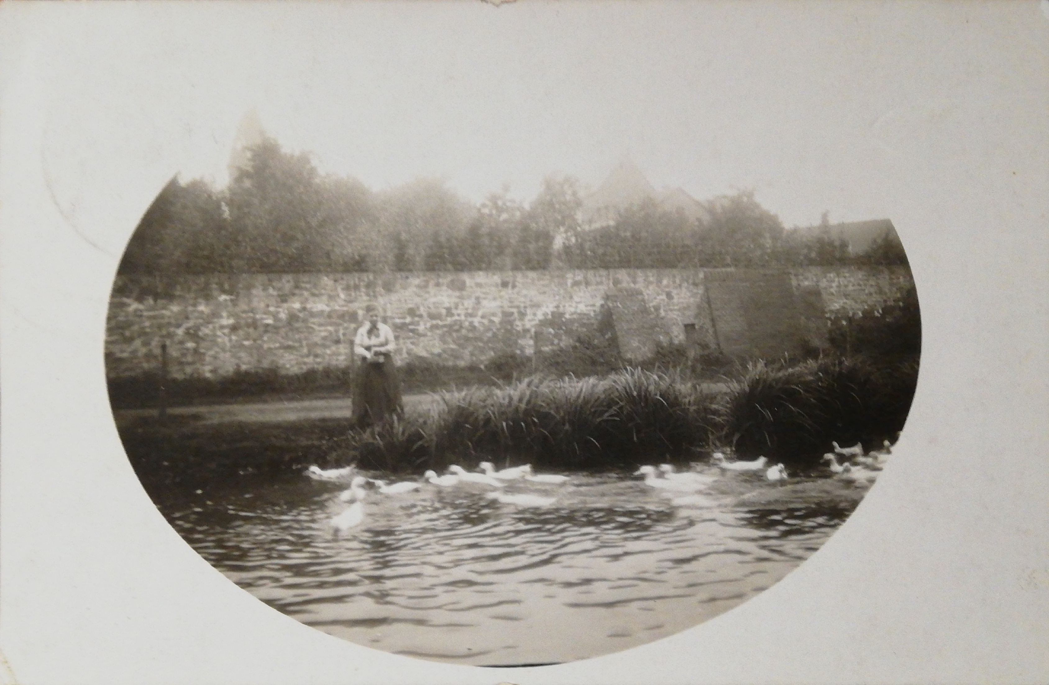 Teich in der Nähe des alten Klosters, Mariaweiler, etwa 1914 (Postkarte, verfasst am 23.Juli 1914 von Isabella von Steffens, an ihre Nichte Lily von Papen, die sich zu dieser Zeit im Hotel Schweizerhaus in Bad Soden-Salmünster auf Kur befand). Bei der Frau auf der Postkarte soll es sich um Fräulein Isabella von Steffens handeln. Die Familie Steffens ist irgendwann in den Adelsstand erhoben worden. Ihr Großvater mütterlicherseits war Franz Josten. Der schenkte zwischen 1835 und 1839 der Gemeinde Mariaweiler ein Grundstück zum Bau einer Schule. Dafür hatte die Gemeinde schon vorher ein Grundstück aus der Versteigerung der Erbengemeinschaft Vaassen- Thelen - Jansen erworben. Dort ist unter Nr. 59 "Ein Viertel zwei Pinten Baumgarten zu Mariaweiler auf'm Kamp, neben Jakob Dollschneider und den Licitanten" aufgeführt. Die Großmutter war eine Tochter des Johann Cremer, der im Jahr 1804 von der Domänenverwaltung das aufgelöste Kloster Nazareth samt Hofgut gekauft hatte. Johann Cremer hatte im Jahr 1804, nach der Beschlagnahmung durch die französischen Besatzer nicht nur das säkularisierte Kloster mit allem was dazugehörte, sondern auch die Schwarzenbroicher Mühle, vermutlich mit finanzieller Unterstützung seines Vaters Peter Fererius Cremer, von der Domänenverwaltung gekauft. [...] Noch zu seinen Lebzeiten ging das Anwesen in den Besitz seines Schwiegersohnes über, denn im Jahr 1844 wurde Gut Nazareth "dem Kaufmann Franz Josten zu Neuss gehörig" zum Rittergut erhoben, was ihm die Möglichkeit eröffnete, in den Provinziallandtag gewählt zu werden. [...] Die Familie von Steffens hat ab mindestens 1860 in Düsseldorf, Hofgartenstraße 4 gewohnt. Exklusive Lage, direkt an der Landskrone. Isabella (Catharina) von Steffens wurde 1855 in Neuß geboren, als Tochter von Albert von Steffens und Isabella Josten (Tochter von Franz Josten, der Mariaweiler ein Grundstück zum Schulbau schenkte, von Isabella Josten sind Reisetagebücher und Briefe erhalten). Eine Schwester der Isabella war die Anna Laura von Steffens (* 1852 in Neuß), die mit dem Offizier und Kommunalpolitiker Friedrich von Papen verheiratet war. Aus dieser Ehe ging der Reichskanzler Franz von Papen (* Werl 1879) hervor. Klara Franzen, die Tochter von Engelbert Franzen und Christine Wingens, war laut Auskunft ihres Neffen Josef Lenzen "in Düsseldorf als Wirtschafterin angestellt bei Frl. v. Steffens (verwandt mit von Papen)".