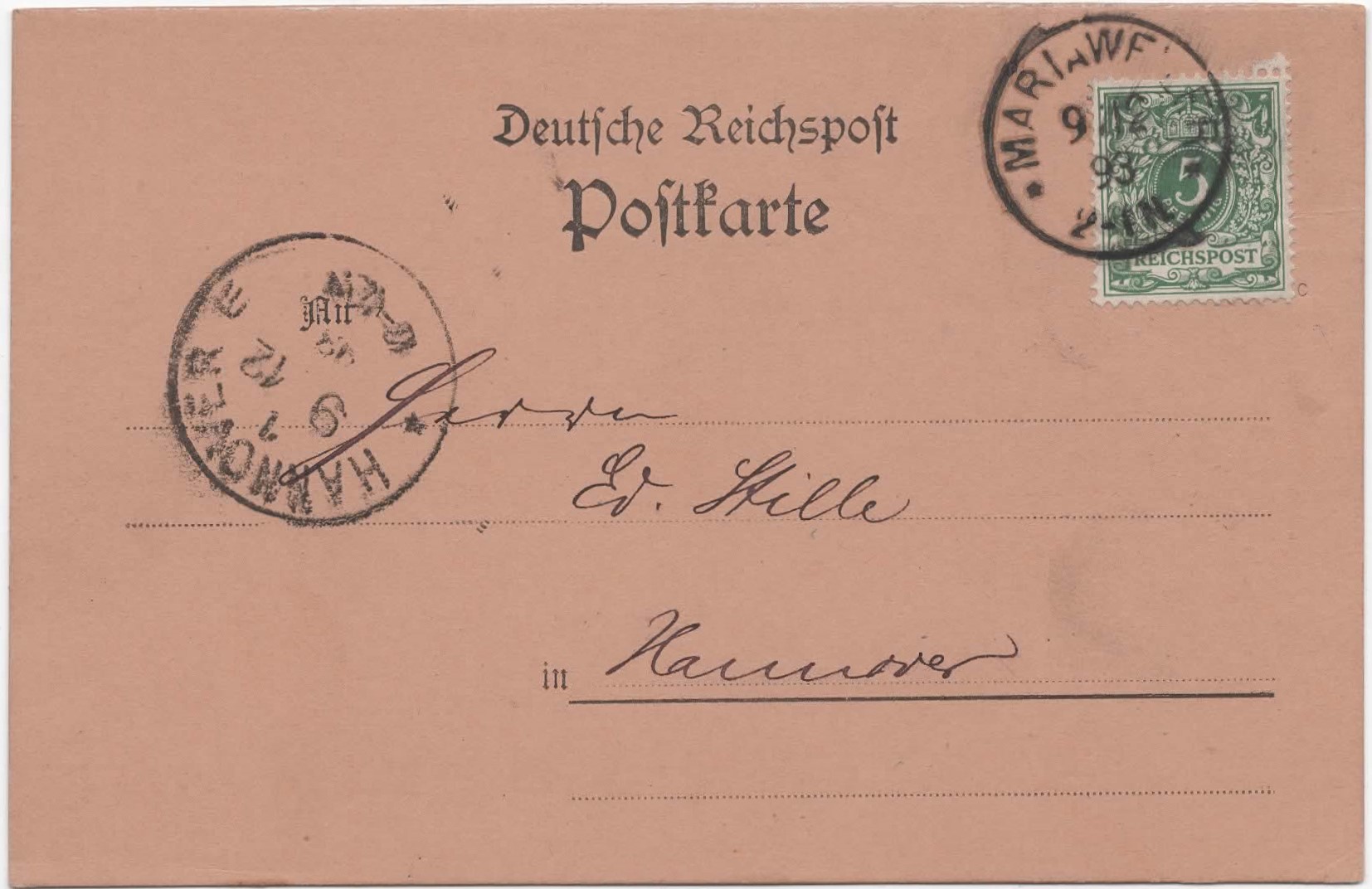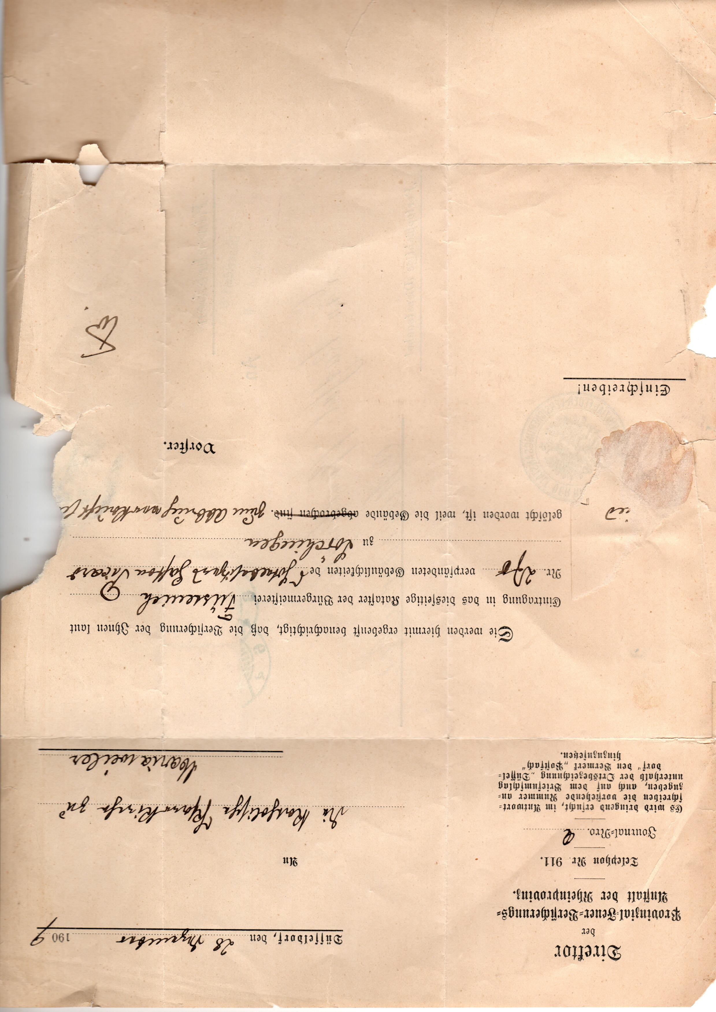 Rückseite der Postkarte: "Fräulein L. von Papen Schweizerhaus Walter Soden-Salmünster L.L. Freute mich sehr zu hören daß es Dir so gut geht, von uns kann ich dasselbe melden. Ich habe das Haus schon seit 8 Tagen voll Arbeiter, es geht aber gut voran. Wasserleitung ist schon fertig, u. Licht werden wir auch in einigen Tagen haben. Hatte kürzlich einen Brief von Franz vom 3.7. Es geht ihm gut. Deine Mutter schreibt auch sehr vergnügt. Herzl. Gruß und weiter gute Kur. Deine Tante Bell Mariaw. d. 23.7.14" Mit "Franz" ist wohl der spätere Reichskanzler Franz von Papen gemeint, ein Bruder der "L." (Lily). Die "vergnügt schreibende Mutter" ist Tante Bell's Schwester Anna Laura von Steffens. Bei dem renovierten Haus handelt es sich um die Villa in der Klostergasse, die innerhalb der Klostermauern stand, und in der die Familie Wilhelm Lenzen wohnte. Isabellas Urgroßvater Peter Fererius Cremer hat Kloster Nazareth nach dessen Auflösung samt Hofgut und wahrscheinlich auch den dazugehörigen Ländereien von der Domänenverwaltung in Düren gekauft. Auch die Teiche unterhalb des Kloster gehörten ja dazu. Isabella ist zumindest Miterbin und damit Mitbesitzerin gewesen. Es wäre zu klären, wann das Haus, [...], das ihr wohl gehört hat, gebaut worden ist. Sicher wird sie dort zeitweise gewohnt haben. [...] Nach dem Tod von Albert von Steffens, bis 1901 war seine Witwe als Eigentümerin aufgeführt. 1902, in ihrem Sterbejahr zusätzlich noch die Töchter Isabelle und Maria. Isabelle wird als "Rittergutsbesitzerin" bezeichnet. [...] Apropos Wasserleitung, die bei Frl. Bella installiert worden ist. 1913/14 wurde in Mariaweiler die erste Wasserleitung verlegt. [Laut] Telefonat mit Hr. Theo Kufferath [...] hat Frl. Isabellas Neffe Franz von Papen das ganze Gelände in Mariaweiler geerbt und es an die BIAG Zukunft verkauft. Das Gebäude, das vorher ausschließlich von Frl. Isabella "und einer anderen Frau", wie H. Kufferath sagte, bewohnt war, ist dann wohl zu Mietswohnungen umgebaut worden. Es muss also eine Räumung stattgefunden haben, die der Herr v. Papen wohl kaum persönlich überwacht hat. Mit "einer anderen Frau" könnte die andere unverheiratete Schwester gemeint sein, die aber schon früher gestorben ist und H. Kufferath die nicht mehr gekannt haben kann. Es kann aber nur der Zweitwohnsitz gewesen sein, da Isabella von Steffens in den Adressbüchern von Mariaweiler nicht aufgeführt ist.