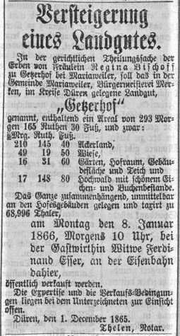 Der Getzerhof blieb aber im Besitz der Familie. Albert Bischoff, Tuchfabrikant, Handelsrichter, Kommerzienrat aus Aachen wurde nächster Besitzer. Er war ein Neffe der Regina Bischoff.