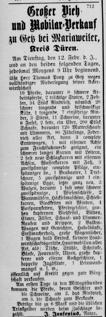 Er verpachtete den Hof; Pächter bis 1878 war Herr Thomas Pontz. In diesem Jahr ließ er seine Ackergerätschaften verkaufen.