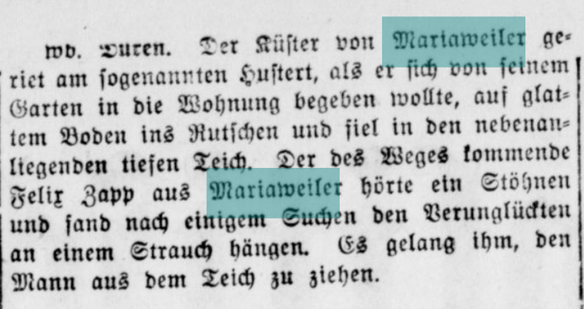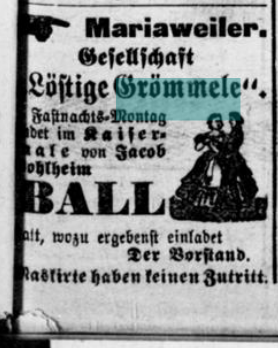Retter Zapp - der zweite Streich (März 2023 - Fortsetzung von "Eine vereitelte Straftat" - zurück)6 Jahre später macht Felix Zapp noch einmal auf sich aufmerksam. Wie im Aachener Anzeiger vom 21. Mai 1929 zu lesen ist, rettet er den Küster von Mariaweiler vor dem Ertrinken im Mühlenteich. Küster und Organist zu dieser Zeit war Wilhelm Brück, hier ein Foto bei der Glockenweihe im Jahr 1928. Im Zeitungsbericht wird als Ort des Geschehens das „Hustert“ genannte Teilstück des Mühlenteiches erwähnt. Das ist das Stück, das hinter der Anne-Frank-Gesamtschule verläuft. ![]() ![]() Karnevalszeit – Zeit für einen Blick 130 Jahre zurück (Februar 2023 zurück)1893 - das Gründungsjahr der ältesten (bekannten) Karnevalsgesellschaft in Mariaweiler. „Löstige Grömmele“ hieß sie. Hier eine Zeitungsanzeige in der Dürener Zeitung aus dem Gründungsjahr. Gefeiert wurde im „Kaisersaal des Jacob Bohlheim“. Wie man sieht, gab es damals auch schon das Vermummungsverbot. „Maski(e)rte haben keinen Zutritt“! ![]() Die Gaststätte Jacob Bohlheim lag in der Aldenhovenerstraße gegenüber dem Bürgerhaus. Das Gebäude, dass heute zur Unterbringung von Flüchtlingen genutzt wird. Den „Kaisersaal“ nennt man heute „Ballermann“. Ja - man mag es kaum glauben. Diese Gebäude sind tatsächlich älter als 130 Jahre. Später wurde auch in den Sälen „Schneider“ (Mariaweiler Eck) und „Berg“ (Mariaweiler Hof) gefeiert. Heute stehen bei Karnevalsveranstaltungen zum überwiegenden Teil Biergläser auf den Tischen. Das war früher etwas anders. Aus Zeitungsanzeigen späterer Jahre ist das ersichtlich. „- nebst Wein wird auch Bier verabreicht“ ist da zu lesen. Rosenmontagsumzüge hat es auch gegeben. Aufgestellt wurde sich am Getzer Hof. 1913 wurde ein Modell des neu zu bauenden Wasserturms mitgeführt. Letztmalig ist eine Zeitungsanzeige der „Löstige Grömmele“ im Jahr 1914 zu finden. Der erste Weltkrieg hat dem Verein wohl den Garaus gemacht.