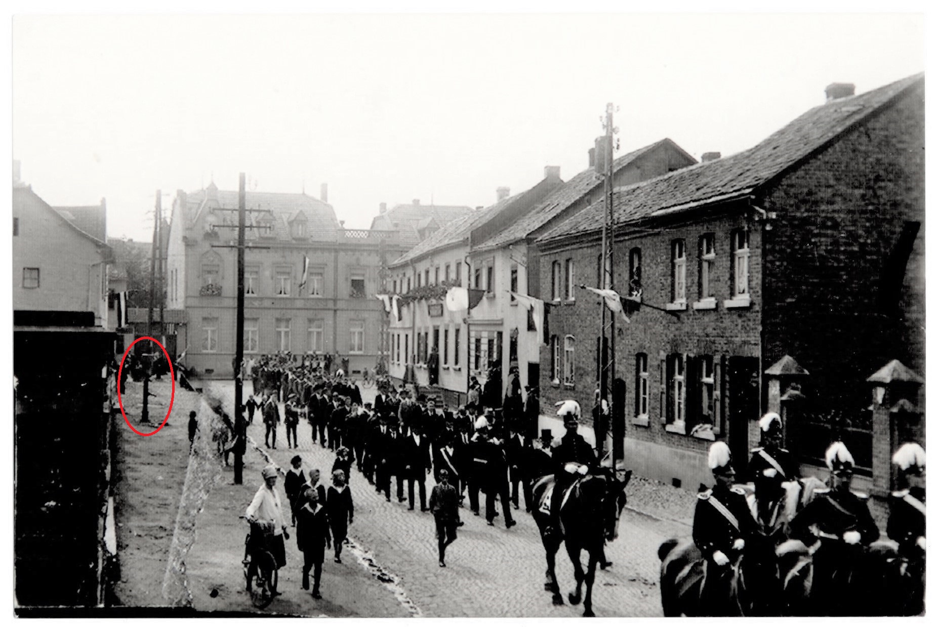 Schaut euch die Bekleidung der Dame mit dem Fahrrad an. Das ist wohl die Mode aus dem Anfang der 1920er Jahre. Passt zum Ereignis, dem Schützenzug im Ort. Das Gründungsdatum der Schützengesellschaft konnte bisher noch nicht ermittelt werden. Hans-Heinrich Linden nennt in seinem Buch „Mariaweiler, ein Dorf im Wandel der Zeit“ als Gründungszeit „um das Jahr 1920“. Wie man sieht, gibt es schon Strom zu dieser Zeit. Wann in Mariaweiler die ersten Stromleitungen verlegt wurden, ist bisher auch noch nicht erforscht.