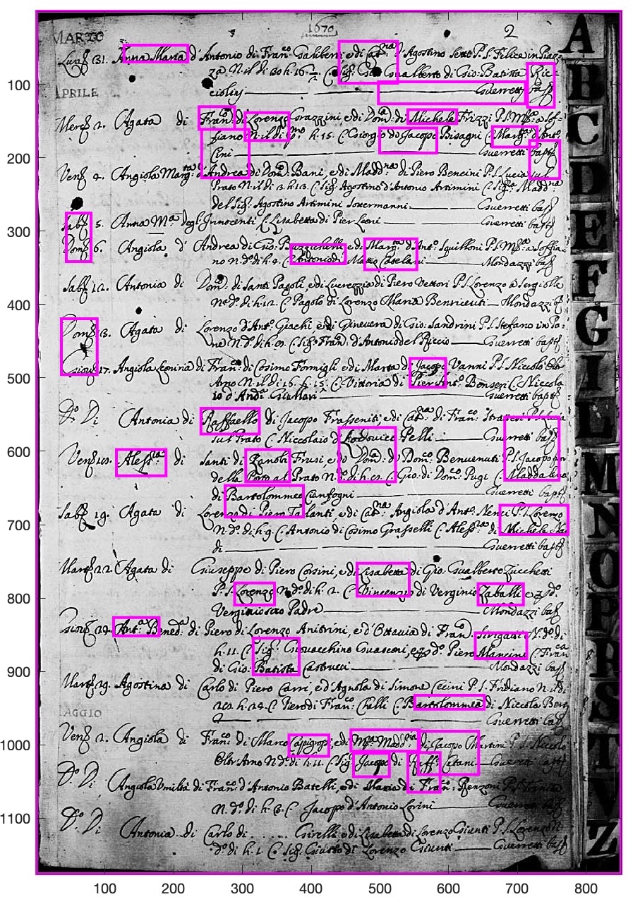 Mitglieder-RundbriefeUnsere Gruppenmitglieder werden regelmäßig von Albert Esser (oder anderen Mitgliedern wenn im Beitragstitel vermerkt) über neue und interessante historische Erkenntnisse informiert. Auf dieser Seite finden Sie unsere Mitglieder-Rundbriefe nach Datum geordnet (neueste zuoberst). Bitten wählen Sie von der linken Menüleiste unter den Rundbriefen aus. Digitale Handschrift-Transkription - ein neuer Anlauf (Oktober 2025, von Manfred Lenzen - Fortsetzung von "Digitale Handschrift-Transkription" - zurück)Meine früheren Versuche, die florentinischen Taufregister digital zu entziffern, waren – sagen wir – von mäßigem Erfolg gekrönt. Mal erkannte das Programm aus „Raffaello“ ein unlesbares Buchstabenbündel, mal verschmolzen „Antonio“ und „di“ zu einem einzigen, neuen Fantasiewort. Häufig scheiterte die Segmentierung schon daran, überhaupt zu erkennen, wo ein Buchstabe endet und der nächste beginnt. Die elegante, aber enge Kanzleischrift mit ihren geschwungenen „C“ und „G“ zog benachbarte Zeilen gleich mit in den Erkennungsrahmen, während Tintenflecken, Schatten oder Papierfalten die Buchstaben zusätzlich verzerrten. Selbst vermeintlich einfache Wörter wie „Cosimo“ wurden teils als „M“ oder „W“ interpretiert – das Programm wusste schlicht nicht, was es sah. Nun also ein neuer Anlauf. Diesmal setze ich auf einen eigens geschriebenen Code, der die Seite systematisch nach wiederkehrenden Schriftmustern durchsucht – sogenannten Templates. Schritt für Schritt werden Schwellenwerte (thresholds) angepasst, Buchstabenabstände getestet, und die Erkennungslogik so verfeinert, dass aus unklaren Formen wieder lesbare Worte entstehen. Die ersten Ergebnisse sind erstaunlich vielversprechend: Das Programm findet nun tatsächlich einzelne Namen – noch nicht immer den richtigen, aber immerhin zuverlässig. Hier also mein neuer Versuch: digitale Paläografie mit Geduld, Code und einer Prise Hoffnung. Die neue Methode funktioniert so: Zuerst sucht das Programm auf der Seite nach Bereichen, die einer Vorlage ähneln – zum Beispiel nach bestimmten Buchstabenformen oder Schriftzügen. Dafür werden kleine Ausschnitte, sogenannte „Templates“, verwendet, die das Programm als Beispiel kennt. Diese vergleicht es mit allen möglichen Stellen im Bild. Wenn ein Bereich ähnlich genug aussieht, wird er als möglicher Treffer markiert. Um die Erkennung genauer zu machen, wurde ein sogenannter HOG-Schwellenwert eingestellt. Dieser bestimmt, wie sicher das Programm sein muss, bevor es etwas als Treffer akzeptiert. Ein niedriger Wert führt dazu, dass viele mögliche Stellen gefunden werden, darunter aber auch viele falsche. Ein hoher Wert, wie hier 50, bedeutet, dass nur wirklich deutliche Übereinstimmungen erkannt werden. Dadurch entstehen weniger Fehlalarme. Außerdem kann man dem Programm beibringen, was es nicht erkennen soll. Dazu werden Ausschnitte von falschen Treffern gespeichert und als negative Beispiele verwendet. Mit der Zeit lernt das Programm also, solche Formen zu ignorieren. So verbessert sich die Erkennung Schritt für Schritt, bis nur noch wirklich passende Schriftzüge oder Wörter gefunden werden – auch wenn sie leicht verdeckt oder schwach gedruckt sind. Segmentierung einer ganzen Taufbuchseite aus den Florenzer Registri Battesimali während der Suche nach "Capitani" (was auf der Seite nicht vorkommt - um die falsche Trefferrate zu ermitteln). Erkannt werden "Capponi", "Codacci", "C.Franco" und "Carraresi", aber zB nicht "Capacci", "Carpolli", "Cammillo" oder "Carboghi". Interessanterweise schlägt das Programm auch ein "Antonio" vor, man siehe wie das "A" etwas wie ein "C" geschwungen ist. Es bleibt also noch Einiges zu tun!