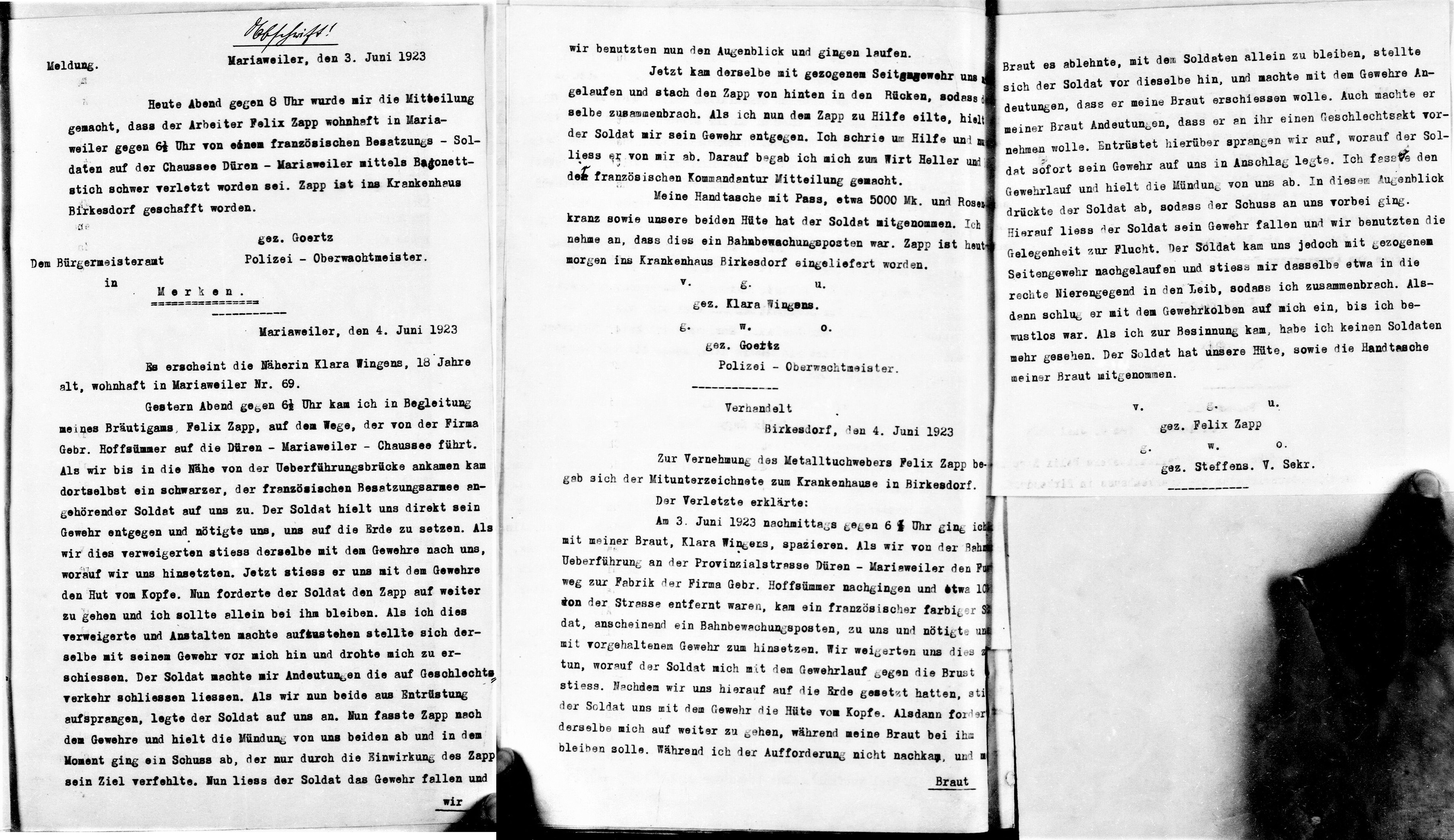 Die Sprengung der Kupfermühle in der Dürener Zeitung von 1971. Von Mariaweiler nach Australien (April 2022 - zurück)Auf dem Bild weiter unten ist die SMS Augusta, ein Schiff der preußischen Marine, das 1864 in Frankreich gebaut wurde. Nach verschiedenen Einsätzen war sie Mitte der 1880er Jahre vollkommen veraltet und wurde nach einer Überholung im April 1885 nur wieder in Dienst gestellt, um Ersatzmannschaft zu anderen Schiffen zu transportieren. Am 28. April 1885 verließ sie Deutschland Richtung Australien. Sie passierte den Suezkanal und erreichte die Insel Perim am Südeingang des Roten Meeres. Dort legte sie in der Nacht vom 1. auf den 2. Juni wieder ab und sollte am 17. Juni Albany in Australien erreichen. Aber vier Wochen nachdem sie Perim verlassen hatte, war die Augusta immer noch nicht angekommen, was zu einer Untersuchung zum Verschwinden des Schiffes und ihrer 222 Mann starken Besatzung führte. Die Untersuchung ergab, dass ein Zyklon das Schiff im Golf von Aden versenkt hatte. Unter den Besatzungsmitgliedern befand sich auch der Feuermeister NIKOLAUS BRÜCK, der am 11. Juni 1860 in Mariaweiler geboren wurde. In verschiedenen Zeitungen wurden die Namen der Besatzungsmitglieder des untergegangenen Schiffes veröffentlicht, wie hier in der „Echo der Gegenwart“. ![]() Die SMS Augusta. ![]() Die Erwähnung des Passagiers Nikolaus Brück im Echo der Gegenwart vom 3.10.1885. Unser Tambourcorps (April 2022 - zurück)Von unserem Vereinsmitglied Dieter Porschen erhielten wir wieder ein Päckchen mit alten Fotos von Mariaweiler und Umgebung. Vielen Dank dafür lieber Dieter. Einige waren uns bisher schon als Scann bekannt, nun sind wir froh, auch die Orignialfotos in unserem Archiv zu haben. Unter ihnen war auch dieses Foto des Tambourcorps Mariaweiler, den es leider nicht mehr gibt. Das Foto ist undatiert. ![]() Der Tambourcorps Mariaweiler ca. 1955-1957. Eine vereitelte Straftat oder der mutige Herr Zapp (April 2022 - zurück)Die Vergewaltigung seiner Braut durch einen Besatzungssoldaten der französischen Armee vereitelte Felix Zapp aus Mariaweiler durch seine Gegenwehr, die ihm schwere Verletzungen durch das Bajonett dieses Soldaten bescheren sollte. Der Vorfall ereignete sich am 3. Juni 1923 an der Überführung der Umgehungsbahn, die früher von Birkesdorf aus über die alte Eisenbahnbrücke hinter der Fa. Heimbach, in einem Linksbogen quer durch das heutige Gewerbegebiet „Nickepütz“, weiter im Verlauf der heutigen „Bahnstraße“ bis nach Rölsdorf führte. Die Überführung befand sich ungefähr an der Stelle, wo sich heute die Straßenabzweigung „Papiermühle / Bahnstraße“ befindet. Hier schildern Felix Zapp und seine Braut Klara Wingens den Tathergang. Gemäß Mitteilung der französischen Militärbehörde, haben die eingeleiteten Untersuchungen zur Ermittlung des Täters zu keinem Resultat geführt. Quellen: Landesarchiv NRW, Abt. Rheinland, Duisburg. Landratsamt Düren BR 0016, Nr. 120 „Verletzung bzw. Tötung von Deutschen durch die Besatzung sowie Unterstützung der Hinterbliebenen". Eine zweiter Streich folgt sogleich. ![]() Die Bürgermeisteramtsakte Zapp vom 4. Juni 1923. Papiermühle Schwarzenbroich (April 2022 - zurück)Was hier doch eher aussieht wie ein gerupftes Huhn, soll einen Adler darstellen, der auf seiner Brust ein Kreuz trägt. Es ist das Wasserzeichen der Papiermühle der Kreuzherren zu Schwarzenbroich. Sie befand sich dort, wo zurzeit die Altenwohn- und Pflegeeinrichtung „Schöner Wohnen“ entsteht. Das Wasserzeichen der Kreuzherren ist seit ca. 1660 nachweisbar, jedoch muss die Schwarzenbroicher Mühle schon eher Papiermühle gewesen sein, denn bereits in den 1640er Jahren lassen sich in Mariaweiler sogar drei Papiermacher nachweisen. Außer der Kupfermühle, die im Jahr 1607 die Konzession zur Papierherstellung erhielt (und damit die erste nachweisbare Dürener Papiermühle war) lässt sich aber eine dritte Papiermühle in Mariaweiler nicht finden. Quelle: Geschichte der Papierindustrie im Düren - Jülicher Wirtschaftsraum“ von Josef Geuenich, 1959. ![]() Das Wasserzeichen der Papiermühle der Kreuzherren zu Schwarzenbroich. Ukraine (März 2022 - zurück)Schon einmal hat die Armee eines Diktators die Ukraine überfallen. Damals wurden viele junge Ukrainerinnen und Ukrainer zur Zwangsarbeit, auch bis nach Mariaweiler, verschleppt. Zwei Arbeiterinnen und ein Arbeiter haben diesen Einsatz nicht überlebt. Sie sind im Krankenhaus in Lendersdorf an Tuberkulose gestorben und hier beerdigt worden. Bereits vergangenes Jahr im November hatte der Geschichts- und Heimatverein Mariaweiler, Herrn Martin Fröhlich gebeten die Daten der dort aufgeführten drei Personen zu aktualisieren, nicht ahnen, wie aktuelle diese Bitte in der Kürze der Zeit werden würde. Er hat uns mitgeteilt, dass dies jetzt geschehen ist.